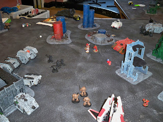 The Forlorne Hope finally receive reinforcements; a full 20 terminators and three multi-melta armed Land Speeders. Unfortunately for them the Terminators are almost entirely wiped out as they arrive by concentrated fire from both the Warhound Titan and the Space Wolves' super heavy tank.